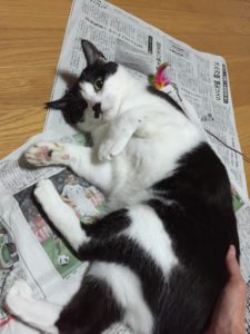 新聞紙が大好きで、もぐったり、新聞紙の下からオモチャを出したりするとハリキって遊びます。