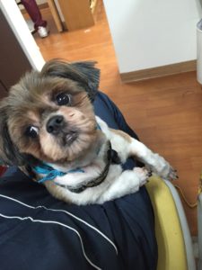 トリミングが終わって遊んでいたら「お膝に乗せて~」とせがまれ・・(^_^;)重くて暑いけど可愛いギンちゃん❤今はイビキをかいて寝ています・・・